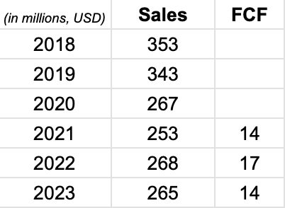 However, (1) operating cash flow pre-working-capital adjustments had been declining every year ($48M in 2018 to $32M in FY23), and (2) you had to deduct finance leases.