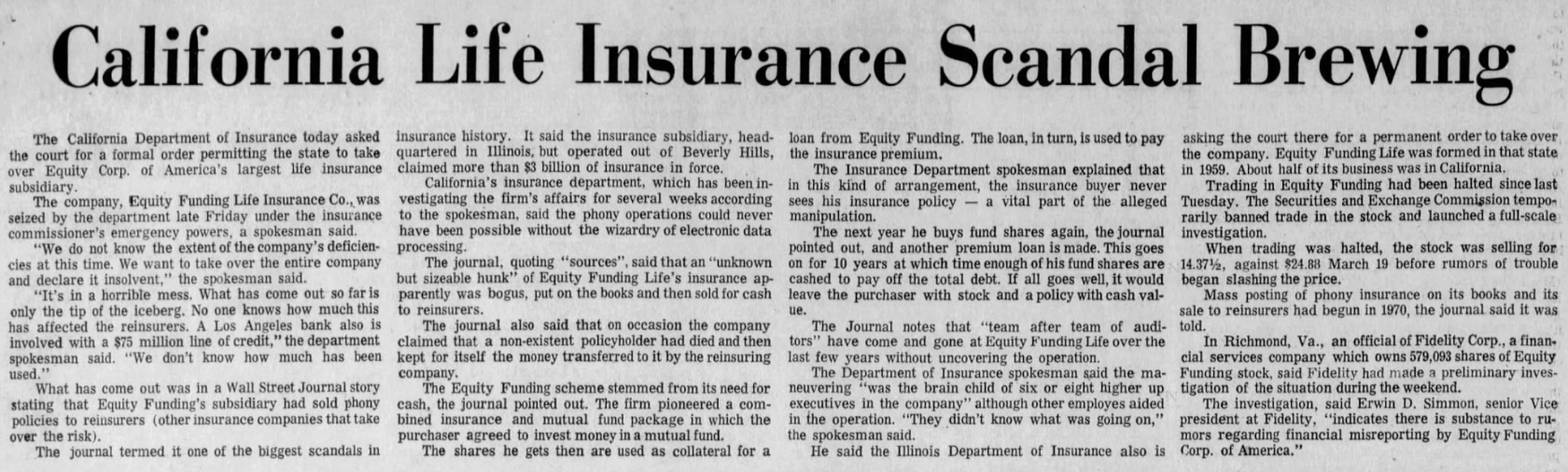 - "Salvage Job: How Equity Funding Escaped Liquidation, Against All the Odds" by William E. Blundell, Wall Street Journal, March 31, 1976