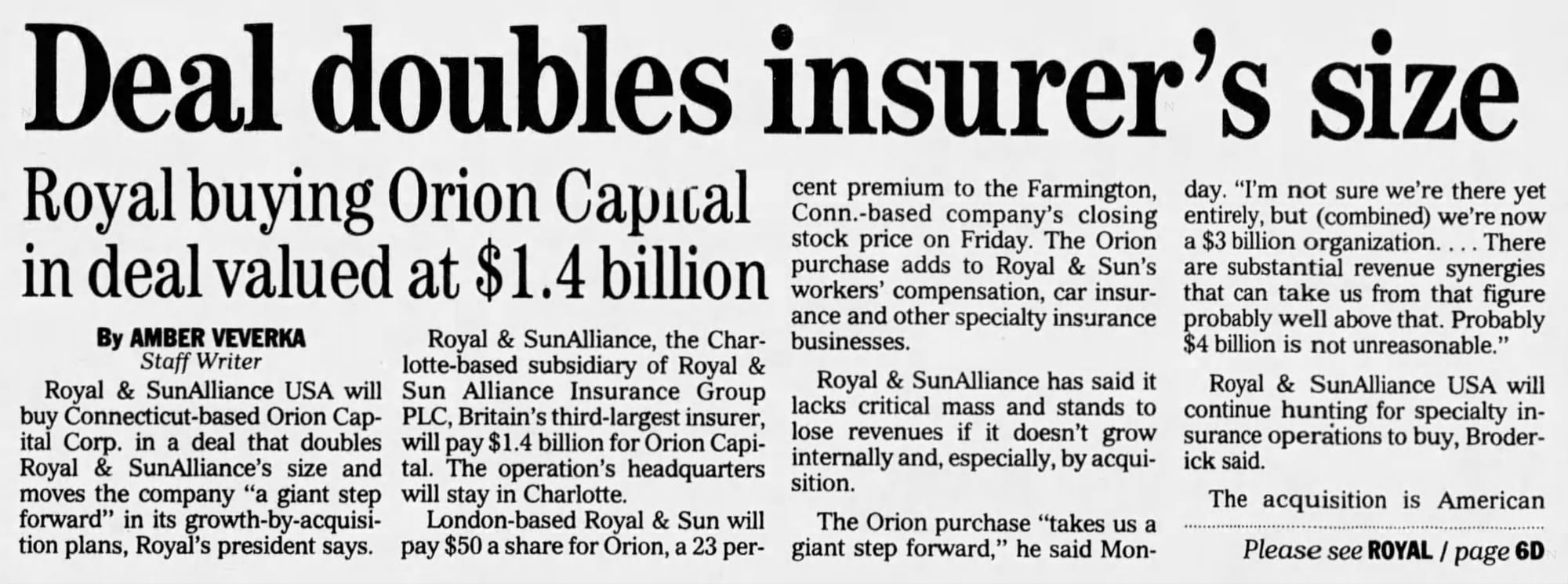 In July 1999, Royal & SunAlliance Insurance Group of London announced it would acquire Orion for $50 cash per share — approximately $1.4 billion including assumption of $460 million in debt.