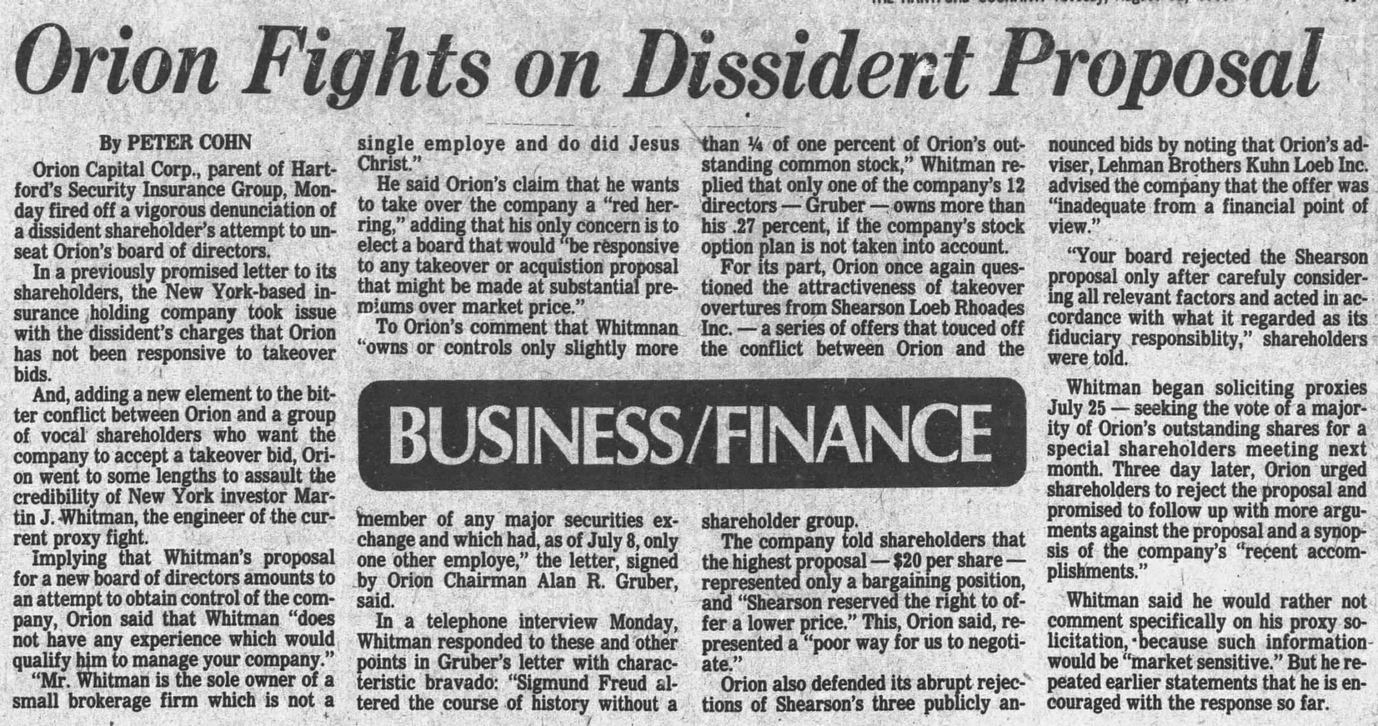 Weill came back at $5.60. Orion rejected it as "grossly inadequate," saying that Weill had offered to improve the "life-style" of top executives with high pay and job security if they supported the takeover.