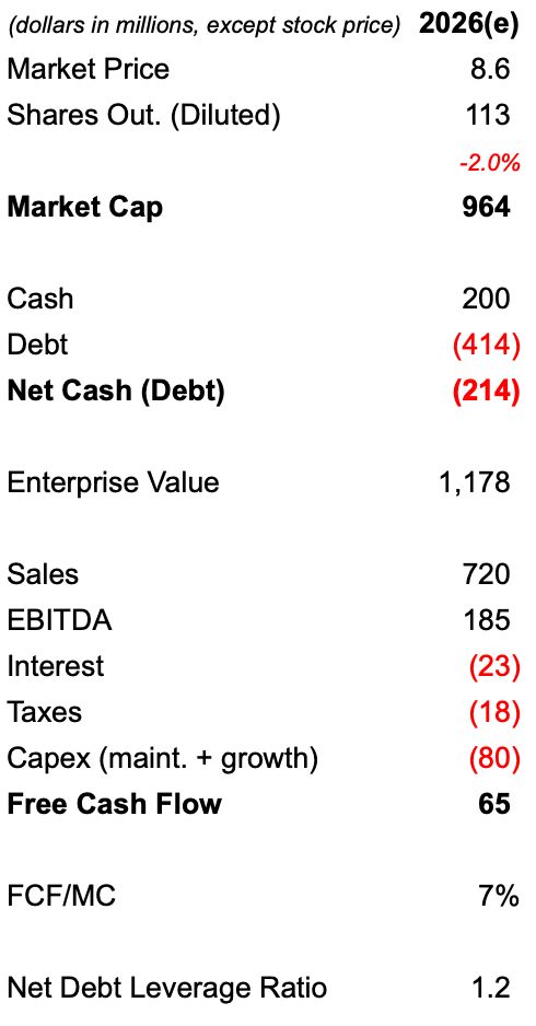 But, using that $65M number and assuming zero growth, just with existing cash on hand + future earnings, they could (theoretically) retire ~10% of their shares outstanding 2026-2030, with no further deleveraging and end up with $60M cash and a net debt leverage ratio of 1.9x. That’d bring my fair value range to $9-14 per share.