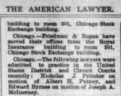 Nicholas’s February 11, 1957 obituary in the Chicago Daily Tribune reported he arrived in Chicago in 1879 and began practicing law in 1900, not 1881 and 1902, respectively, as he remembered in his autobiography. Given the timeline of Russian pogroms and a 1902 announcement in The American Lawyer of Nicholas’s admittance to practice law, I’m inclined to believe the obituary was incorrect on both accounts. ↩