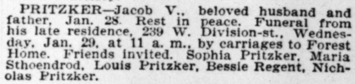 When the mob receded and the Pritzkers came down from the attic, they found their property wrecked. This experience, coupled with the political landscape (particularly concerning Nicholas’s older brother Abram who breached several conditions of his parole) was an inflection point in the Pritzker family story. Jacob committed to get his family out of the country.