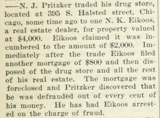 What Nicholas omitted in his autobiography, according to an October 1895 article in The Pharmaceutical Era, was he was defrauded in a real estate trade with the Halsted property and ultimately had the man arrested.